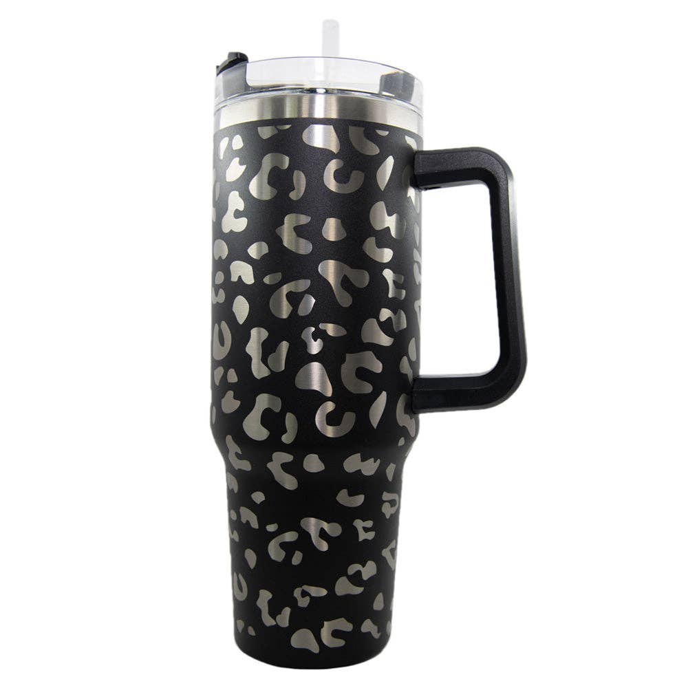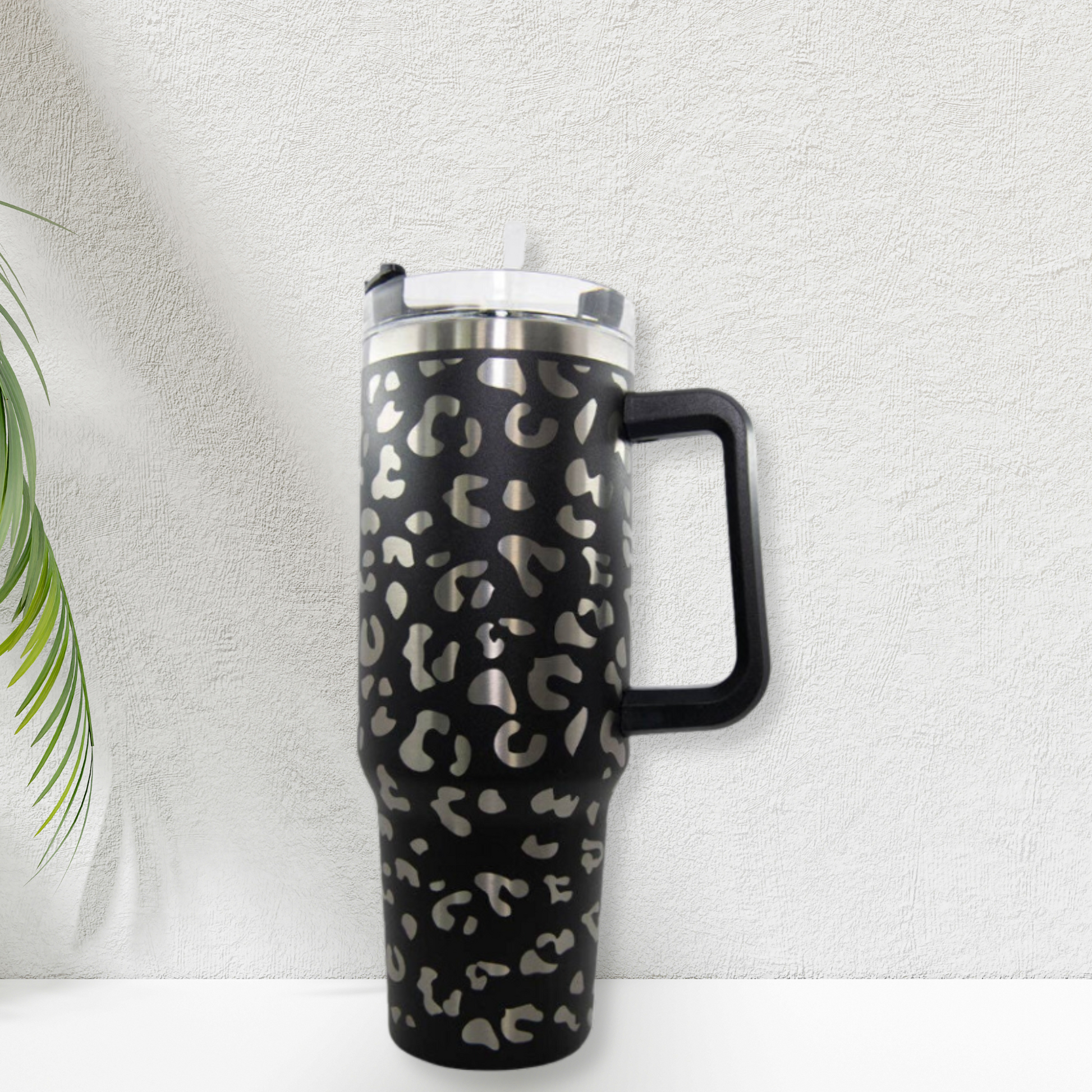Get wild and add a splash of style to your routine with our Black Metallic Leopard 40 Oz Tumbler. The 40 oz size is great when you're on the go — Plus, it comes with its own drinking straw so you can sip in style wherever you go. Best yet, it fits perfectly in most car cup holders so you can take along some refreshment while driving wherever life leads you. The 40 ounces tumbler includes a reusable plastic straw, all-day chill or heat, stainless steel interior, hand wash preferred, screw-on plastic top with straw opening adjustable straw cover for easy travel easy-to-hold handle fits in car cup holder (3” diameter at base)