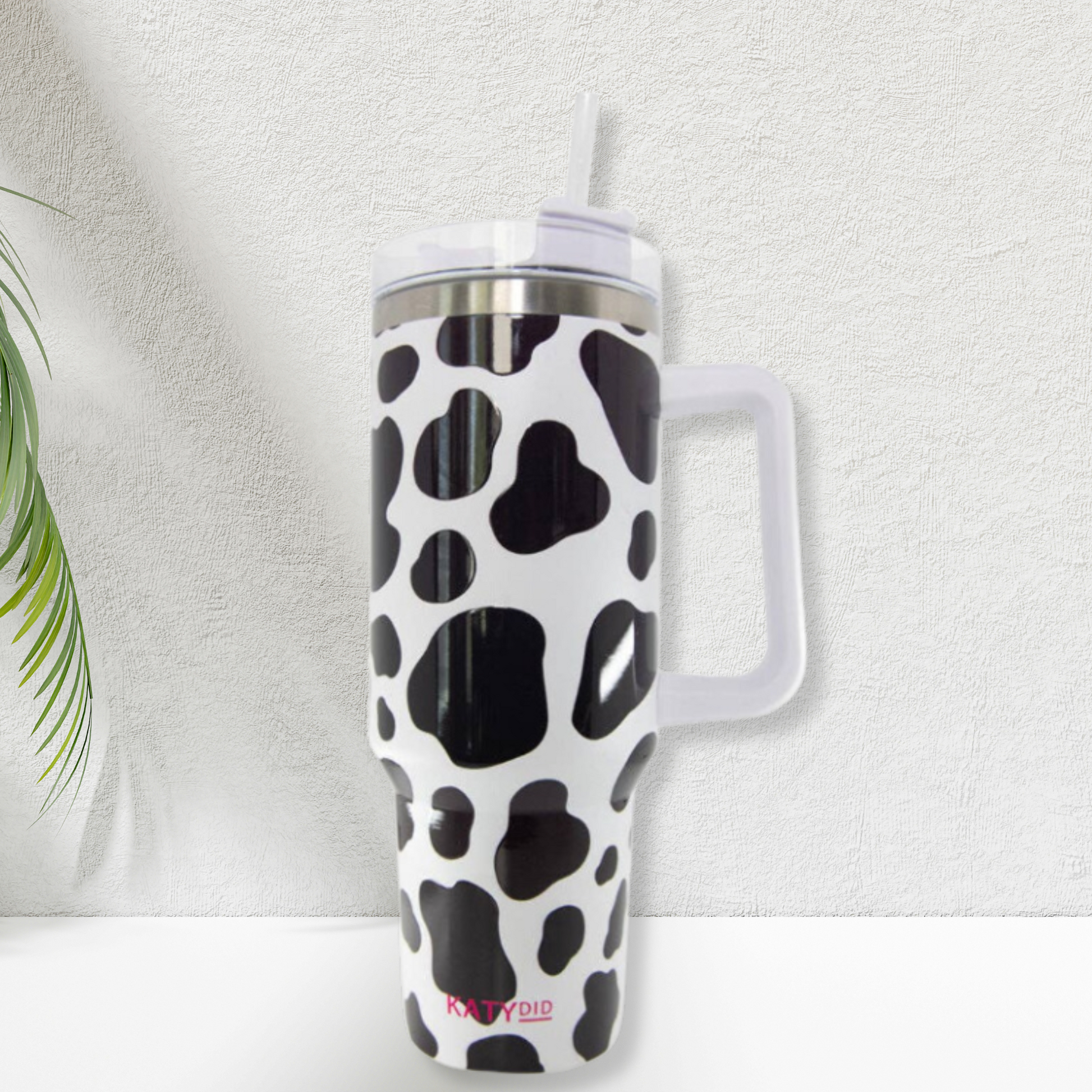 Welcome to the wild west! Now you can accessorize your style with the amazing Katydid Cow Print 40 oz Tumbler. Whatever your beverage choice is, this tumbler will be a unique addition to your look. Made of top notch quality stainless steel and adorned with a black and white cow print pattern. The 40 ounce tumbler includes a reusable plastic straw, all-day chill or heat, hand wash preferred, stainless steel interior, screw-on plastic top with straw opening, adjustable straw cover for easy travel easy-to-hold handle fits in car cup holder (3” diameter at base)