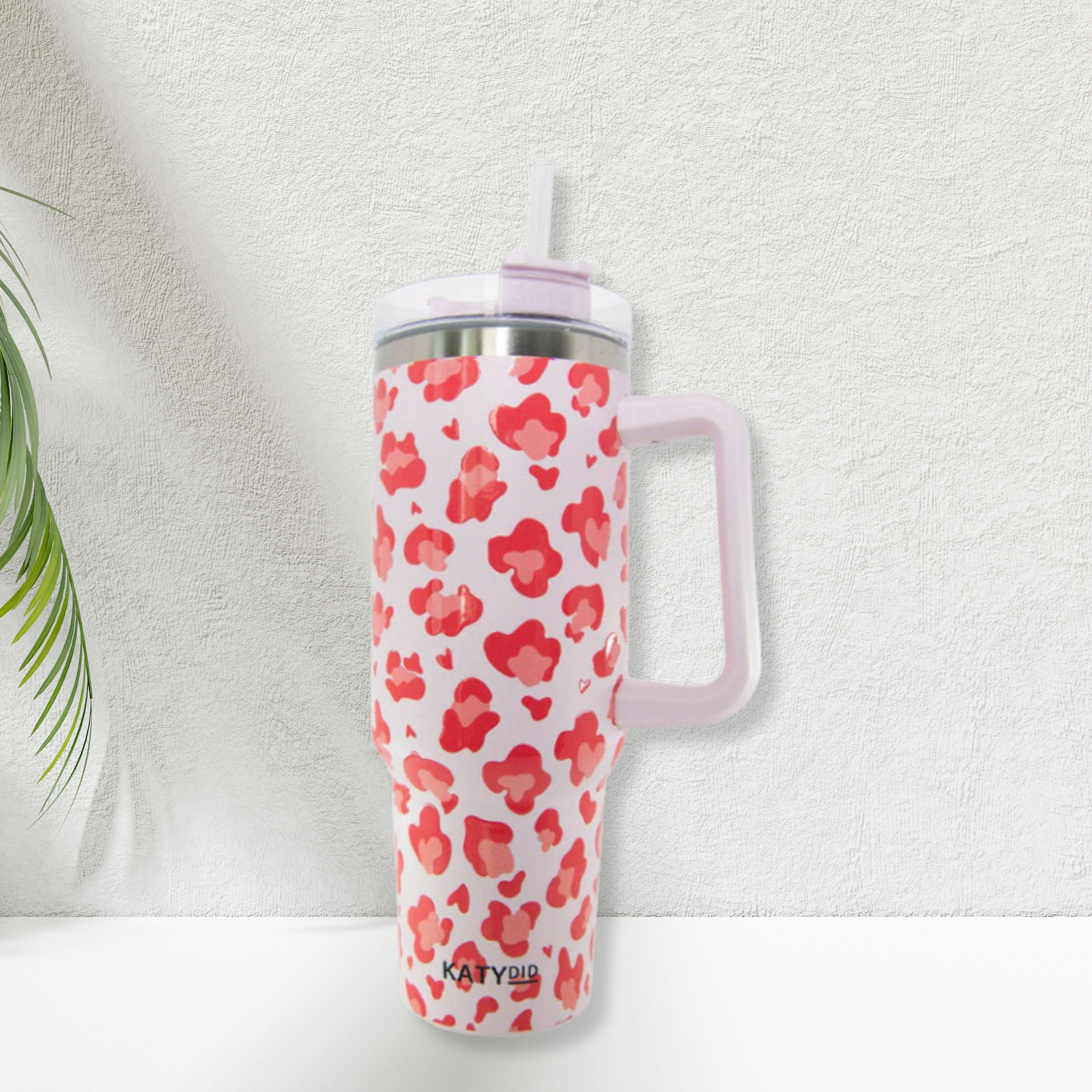 The Pink and Red Leopard 40 ounce tumbler includes reusable plastic straw, all-day chill or heat, stainless steel interior, hand wash preferred, screw-on plastic top with straw opening, adjustable straw cover for easy travel, easy-to-hold handle, and fits in most car cup holders (3” diameter at base)