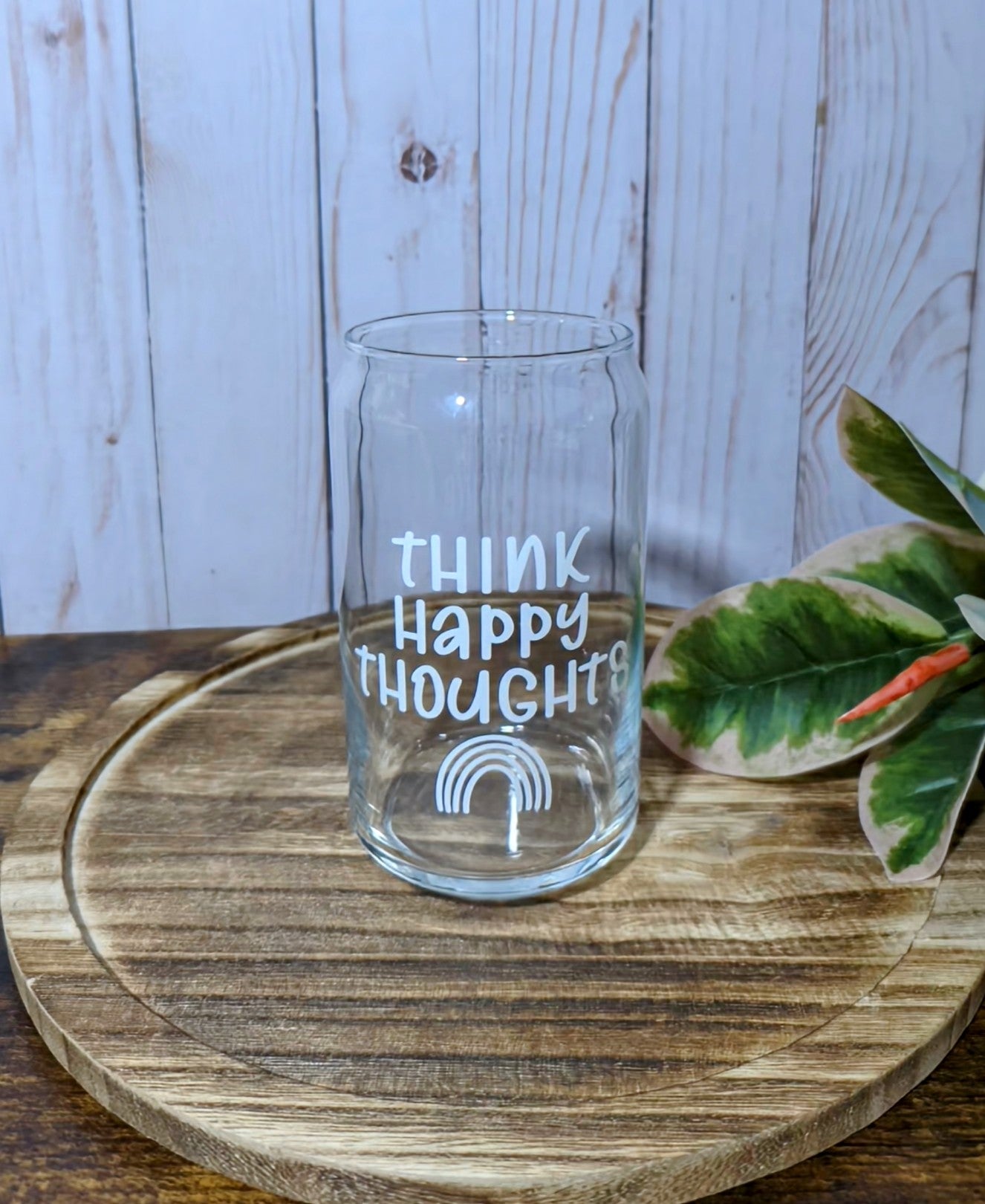 Think Happy Thoughts 16 oz Can Glass Cup (Dishwasher Safe)