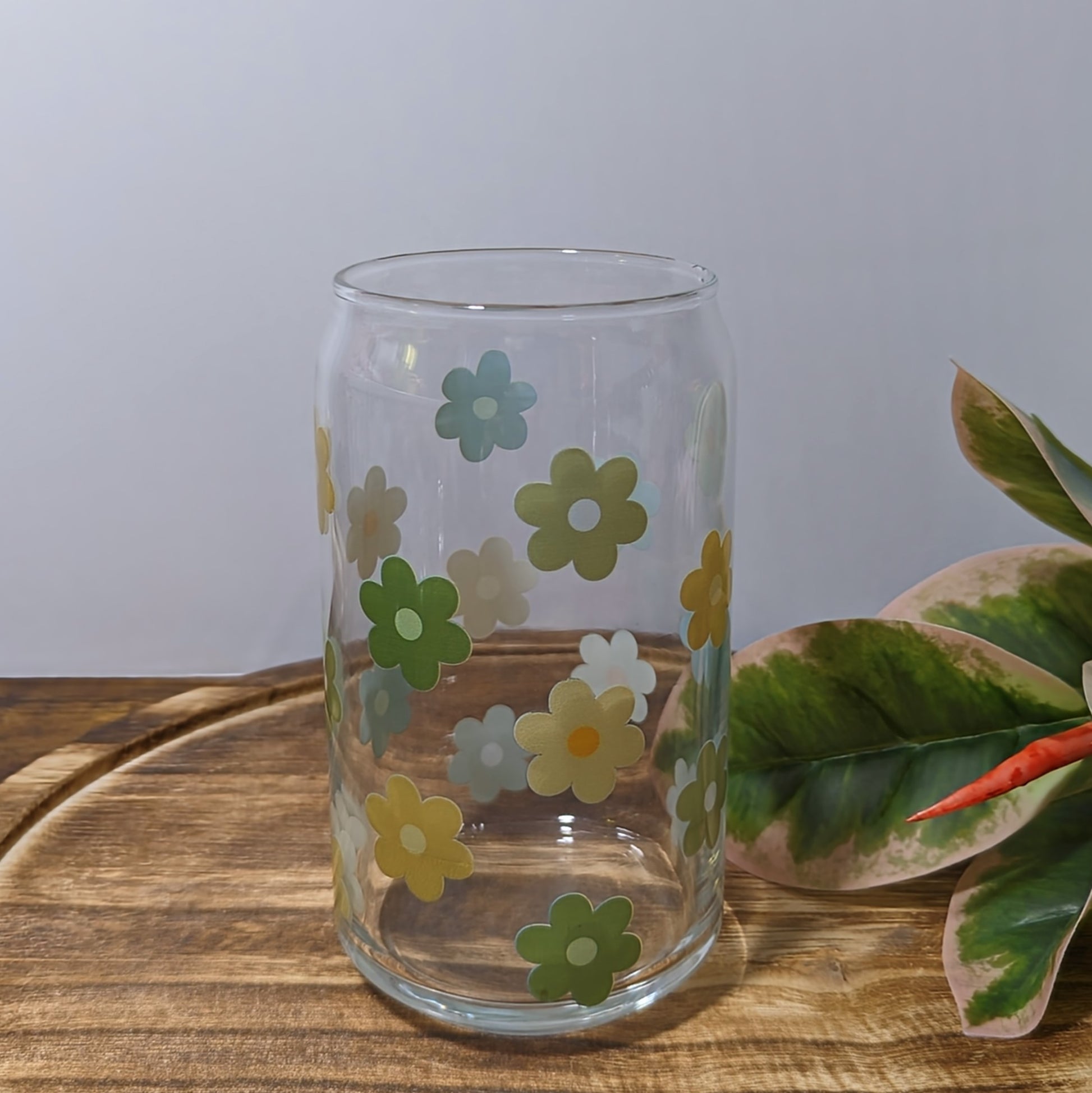 16 oz can glass cup is perfect for your favorite hot and cold beverages. Daisy design is printed all around the glass making it a seamless wrap. The designs are professionally adhered onto the glass (this is not vinyl) using high quality and durable ink! This printing method is more resistant to scratches, wear and tear, sun exposure and daily use. The cups are dishwasher safe! Cups can be washed 300+ times in the top rack of the dishwasher.