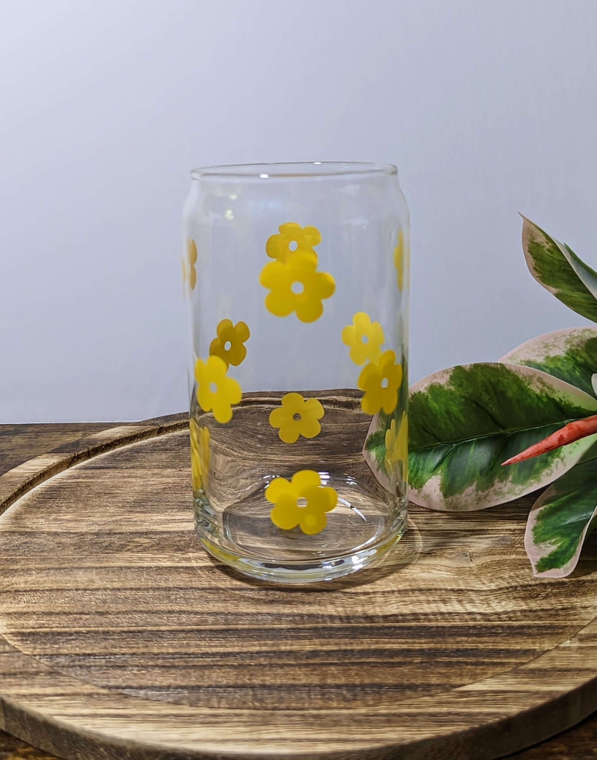 16 oz can glass cup is perfect for your favorite hot and cold beverages. Yellow retro flower design is printed all around the glass making it a seamless wrap. The designs are professionally adhered onto the glass (this is not vinyl) using high quality and durable ink! This printing method is more resistant to scratches, wear and tear, sun exposure and daily use. The cups are dishwasher safe! Cups can be washed 300+ times in the top rack of the dishwasher.